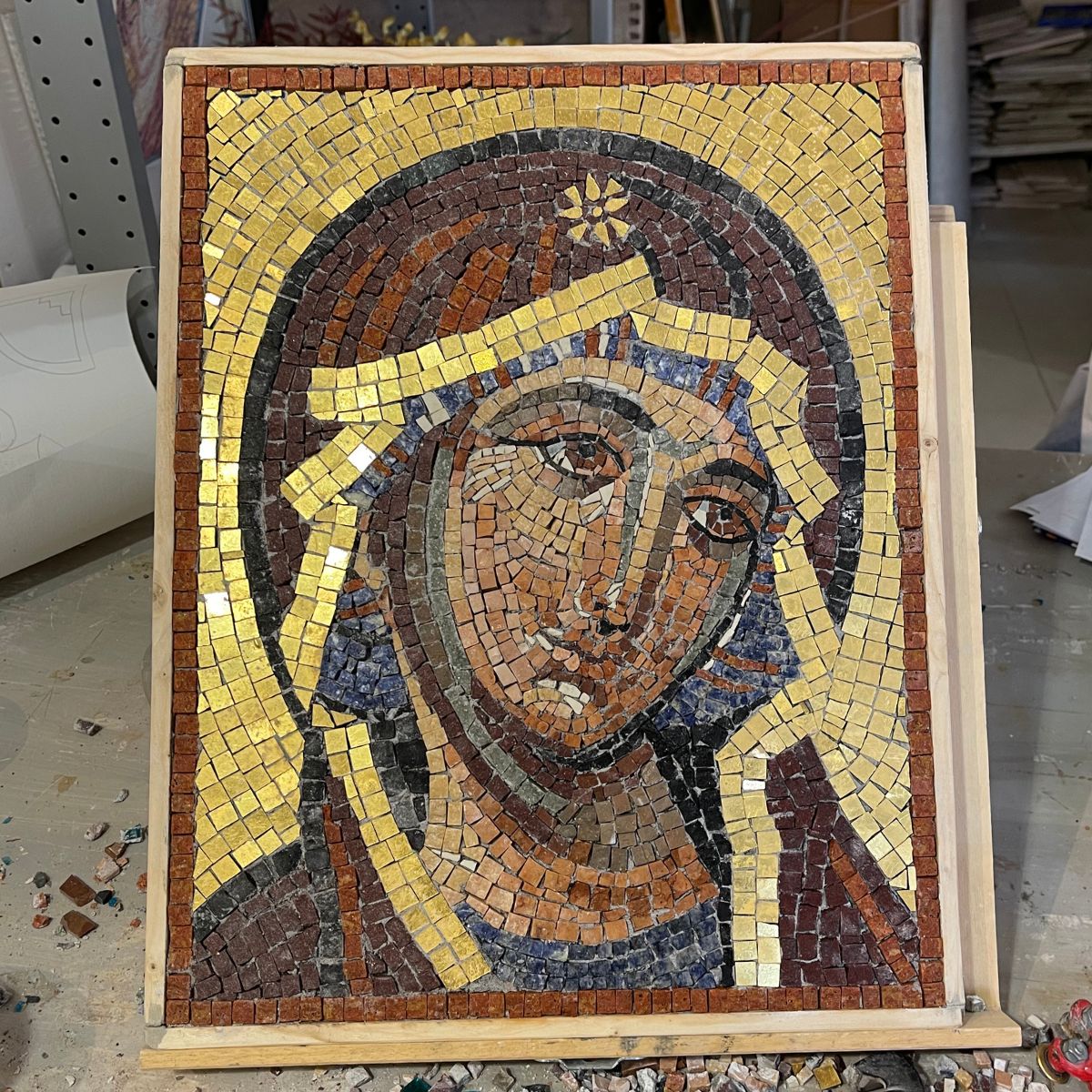 Il kit mosaico Icona Bizantina (soggetto classico ispirato all'iconografia bizantina) è realizzato artigianalmente a mano nel laboratorio della scuola di mosaico In Tessere (Italia) con materiali di altissima qualità.
