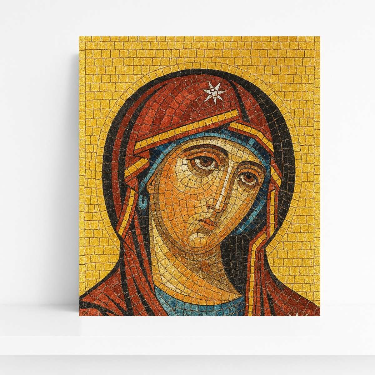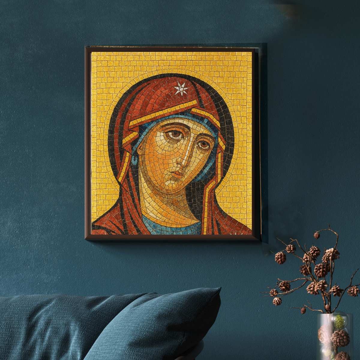 Il kit mosaico Icona Bizantina (soggetto classico ispirato all'iconografia bizantina) è realizzato artigianalmente a mano nel laboratorio della scuola di mosaico In Tessere (Italia) con materiali di altissima qualità.
